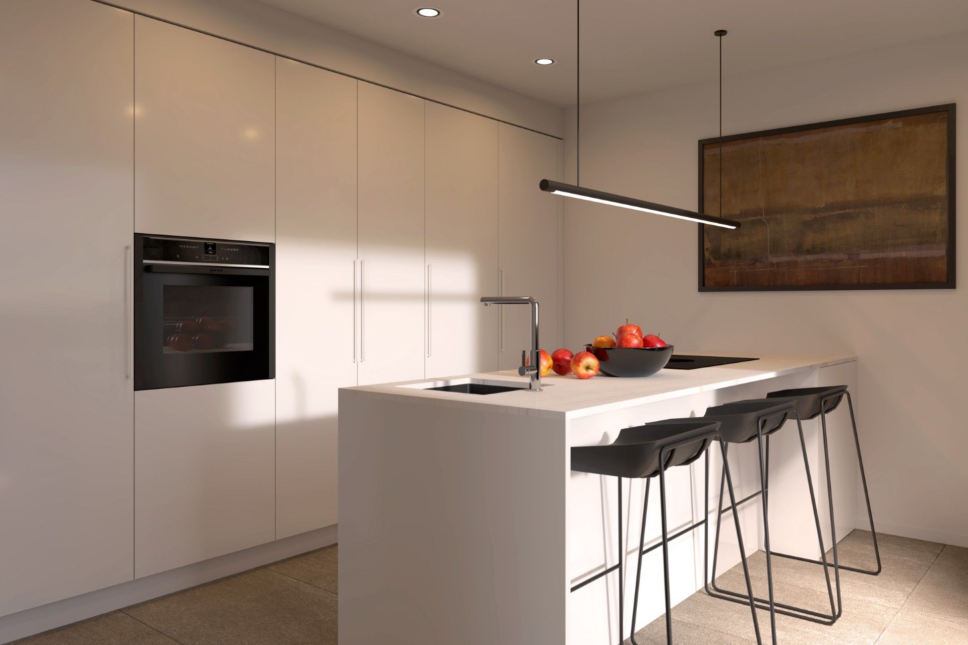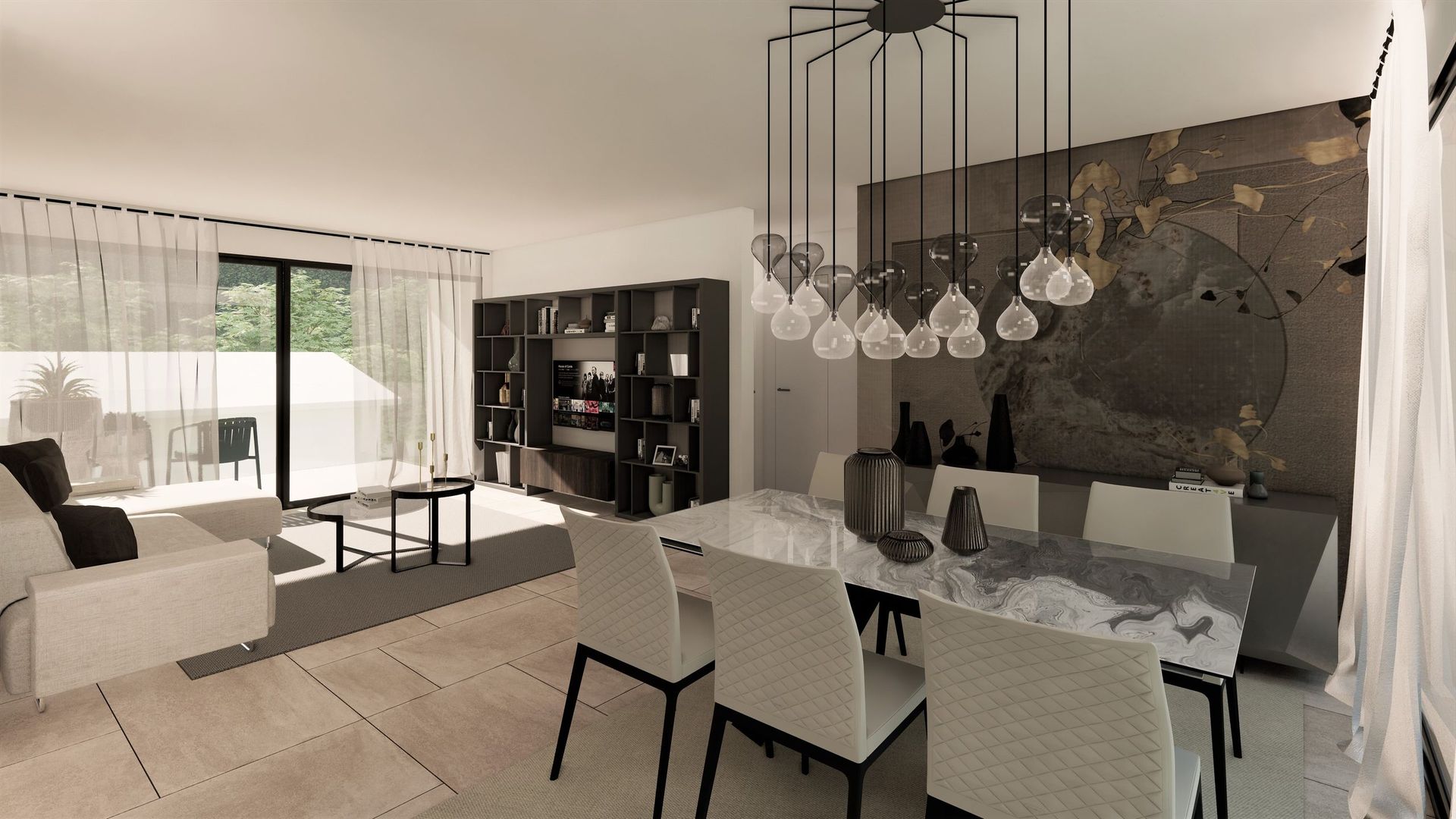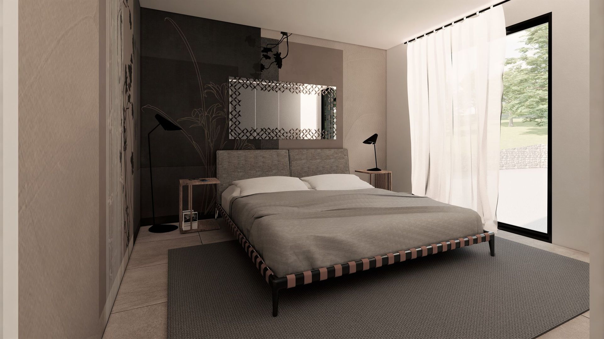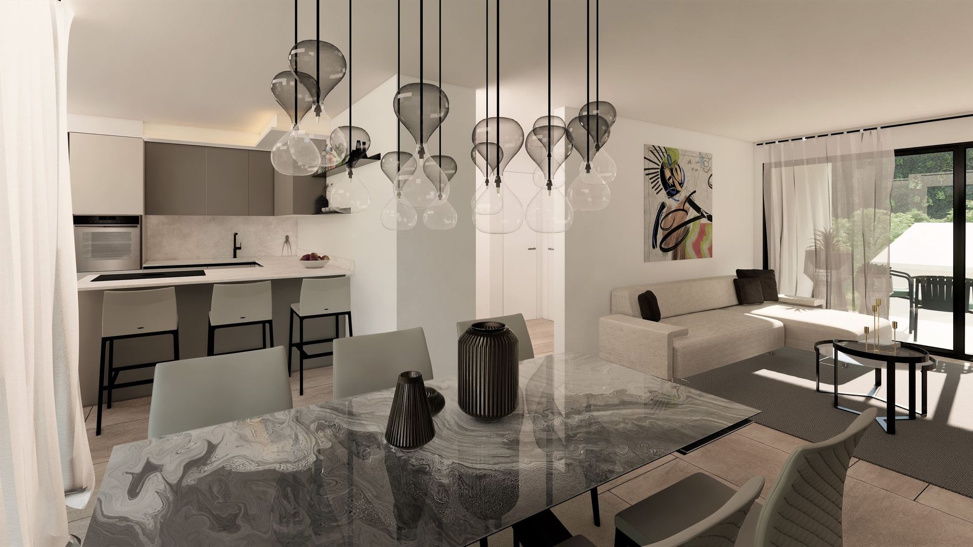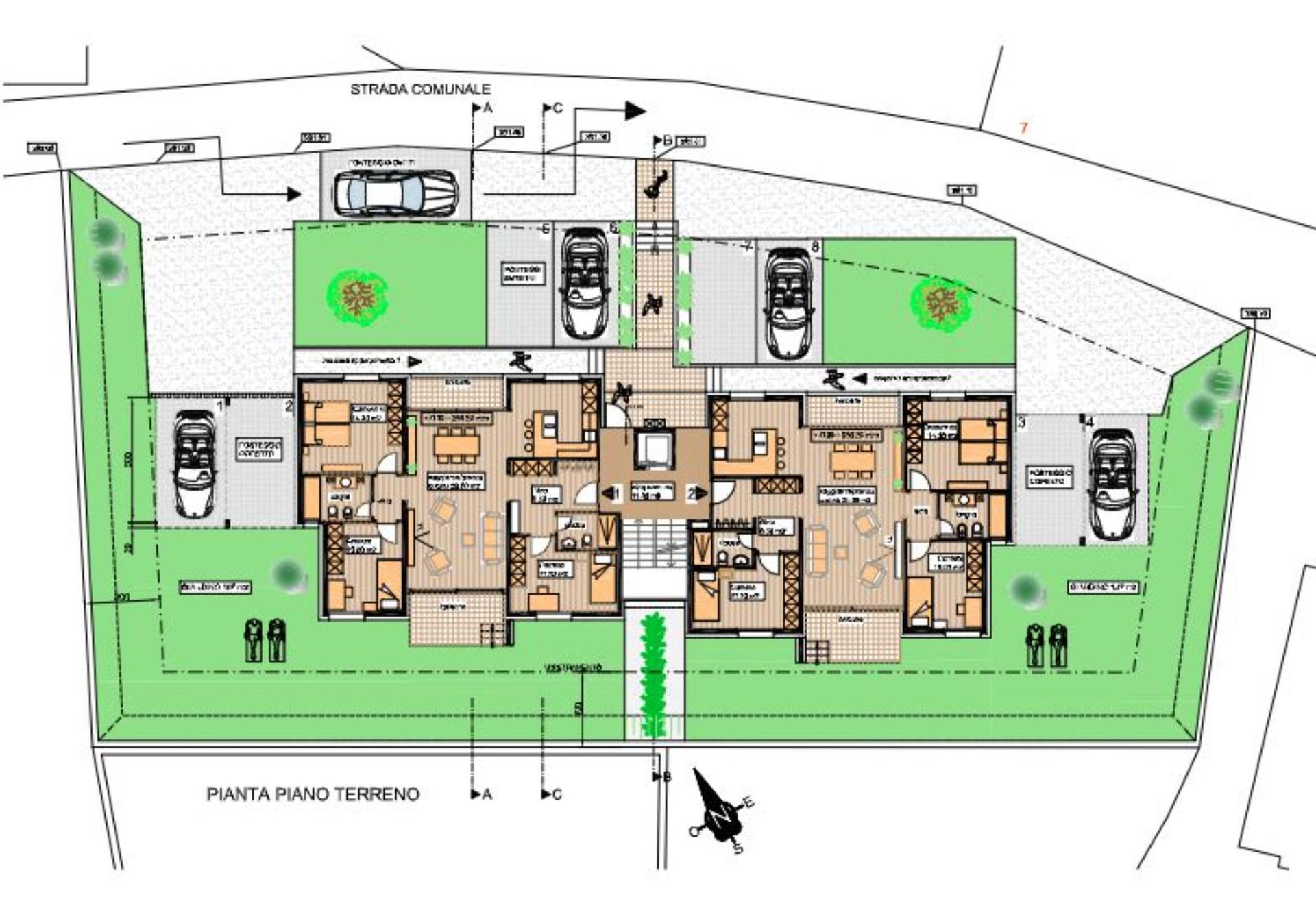 Ogni appartamento dispone di un ampio atrio ingresso con armadio a muro e zona disimpegno, subito all'ingresso troviamo una camera ospiti o studio con un locale doccia di servizio. Dall'ingresso si accede all'ampia zona soggiorno / pranzo con cucina posizionata in zona separata ma collegata al pranzo. Dalla zona soggiorno e pranzo si può accedere ai balconi o giardino. Nella parte finale dell'appartamento troviamo la camera matrimoniale, una camera singola ed un bagno.